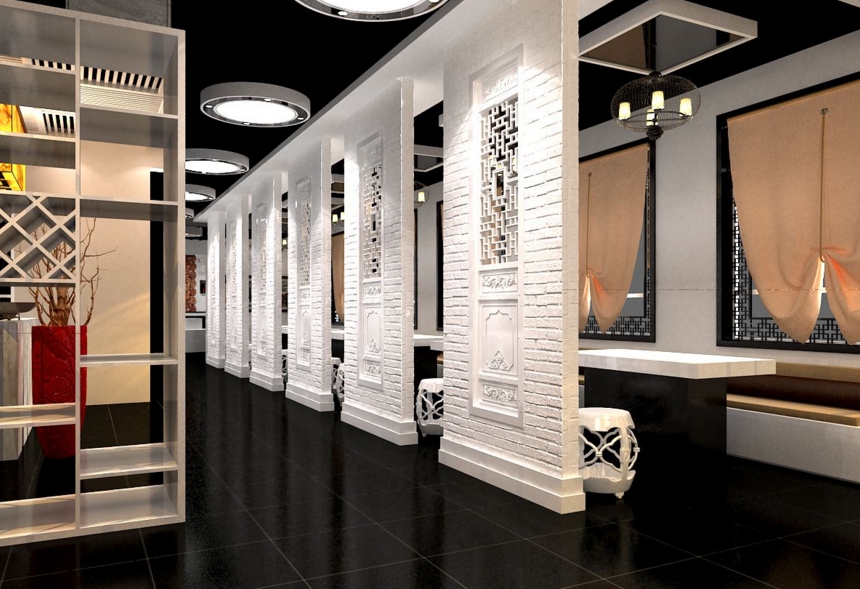侧界面一般垂直于地面,其占有的界面比重大,从视觉角度对人的影响很大。由于商店营业厅中的墙面基本上给货架、展柜等道具遮挡,因此墙面,般只需用乳胶漆等涂料涂刷或喷涂处理即可,但营业厅中的独立柱面往往在顾客的最佳视觉范围内,因此柱面通常需进行一定的装饰处理,例如可用木装修或饰面砖及大理石等方式处理,根据室内的整体风格,有时柱头还需要做一定的花饰处理。